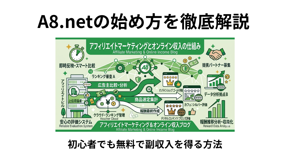 A8.net(エーハチネット)は、日本最大級のアフィリエイトサービスプロバイダ(ASP)です。この記事では、A8.netの特徴と始め方を初心者向けにわかりやすく解説します。