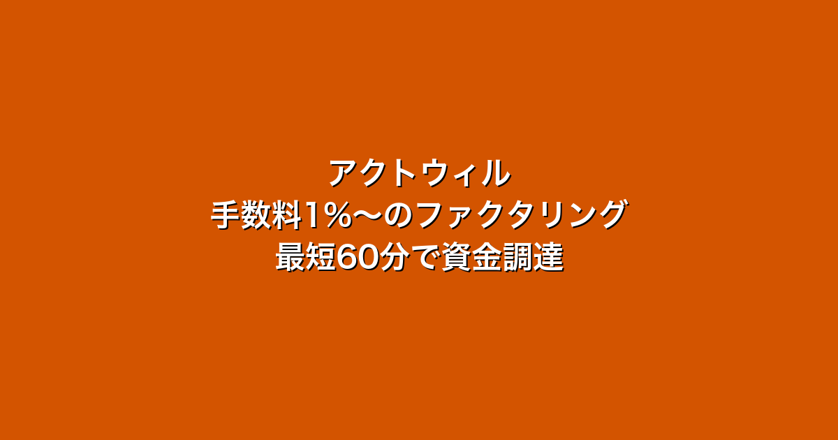 アクトウィルは、最短60分で資金調達が可能なファクタリングサービスです。手数料1%〜と業界最低水準で、多くの事業者に選ばれています。